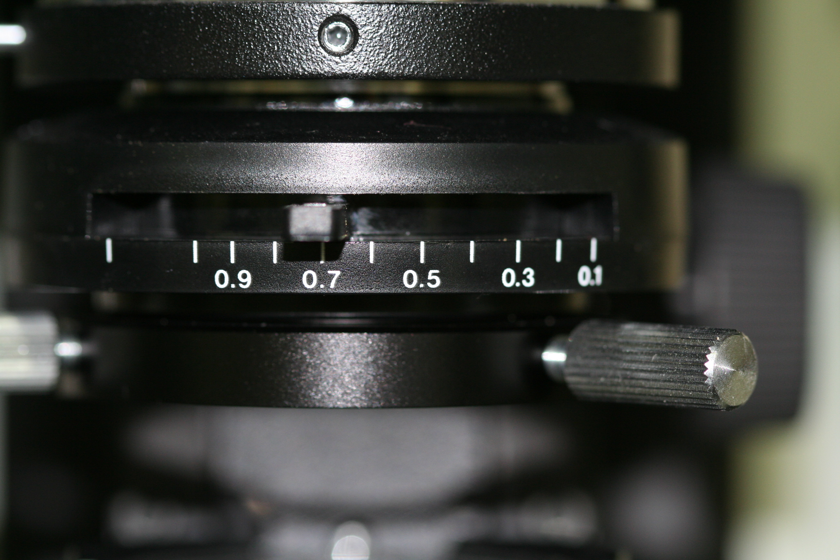 上位機種にはコンデンサー(集光器:Condenser)がついており,コントラストや焦点深度を調整できる。コンデンサーは,普通は一番上に上げて使用する。しぼりをしぼると暗くなるが,コントラストが上がり,像はハッキリと見えるようになる。通常は開口絞り環の数字を使用する対物レンズの表示に合わせ,正面に来るようにする。