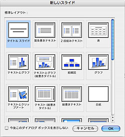 2.新規プレゼンテーション、新規スライドともに、「新しいスライド」ダイアログが表示されるので、作成したいスライドのタイプを選択する。