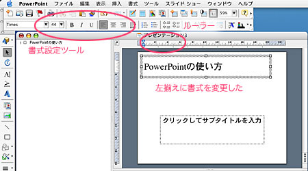 - テキストボックス内の書式は、Wordと同じように「書式設定ツール」や「ルーラー」を利用して変更できる。