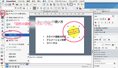 2.図形描画ツールの「図形の調整」−「グループ化」を選択する。