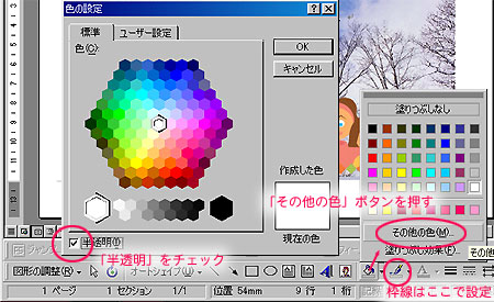 - 塗りについては、「その他の色」を選択して、表示されたダイアログで「半透明」をチェック。